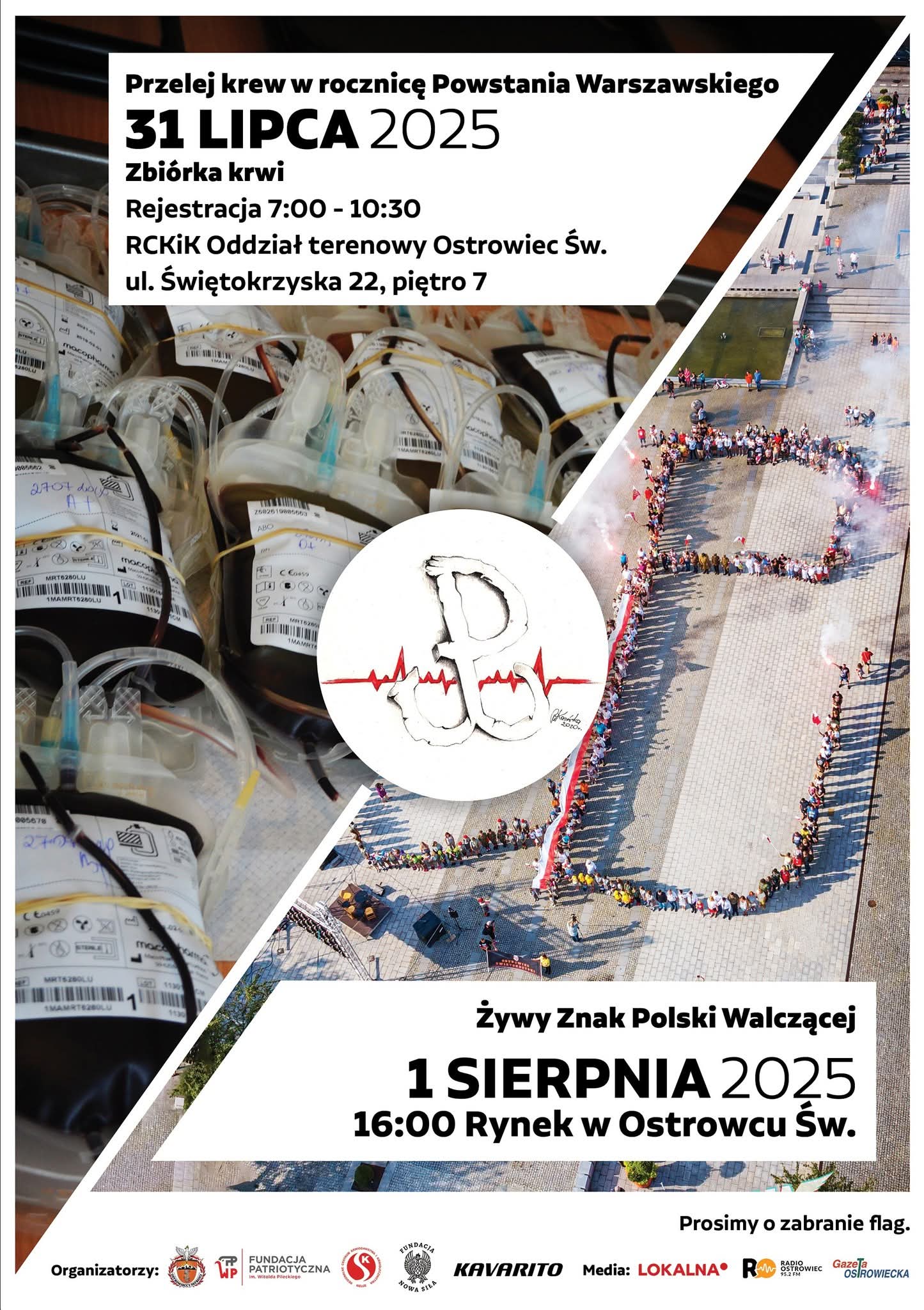 31 lipca w godzinach porannych w RCKiK w Ostrowcu Świętokrzyskim odbyła się zbiórka krwi w ramach akcji Przelej krew w rocznicę Powstania Warszawskiego, podczas której udało się zebrać ten drogocenny dla potrzebujących płyn od 19 osób. Za tę postawę wszystkim dziękujemy. Krwiodawcy otrzymali oprócz czekolad, kubki ofiarowane przez Urząd Miasta w Ostrowcu i wspaniałe koszulki ze znakiem Polski Walczącej, które ofiarowała Fundacja Patriotyczna im. Witolda Pileckiego. Bardzo dziękujemy RCKiK za kolejny, 11 rok owocnej współpracy.